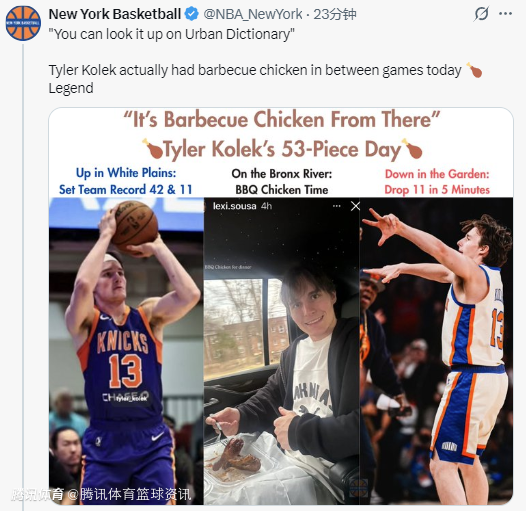 尼克斯媒体New York Basketball发文报说念了此事,金宝博还配发了科洛克享用烤鸡的图片。该媒体还写说念:“科洛克今天在两场比赛之间真吃了烤鸡,简直神奇的一刻。”