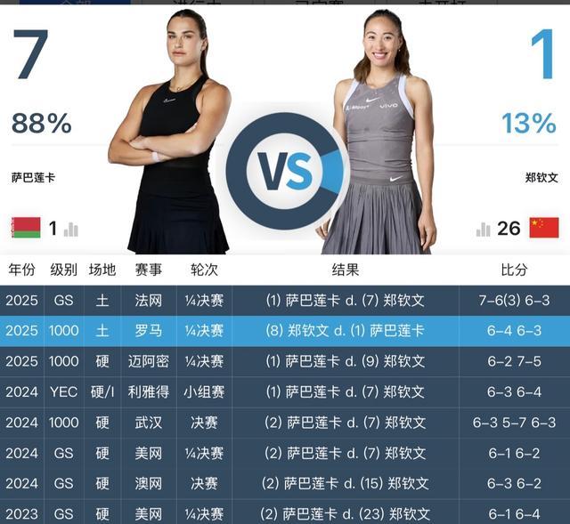 郑钦文唯独打败萨巴伦卡的比赛是在2025年的罗马站1/4决赛188金宝博,她以6-4/6-3凯旋。此次,郑钦文能否翻越寰宇第一这座大山?