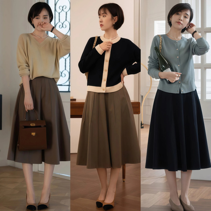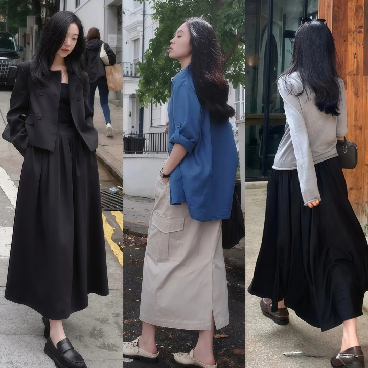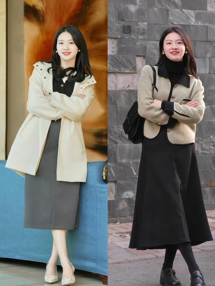 周一通勤穿一件修身毛衣,塞进高腰半身裙再踩一对玄色乐福鞋,干练多礼,周末约一又友喝咖啡换一条百褶裙配芭蕾舞鞋,暄和淑女,相通是低跟鞋加半身裙的基础底细,换个式样格调就能解放切换,这才是这组搭配最是非的地点。