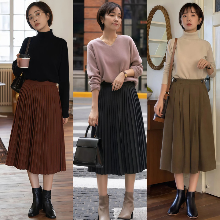 top2:百褶裙+短靴+毛衣/衬衫,均衡“青娥”感