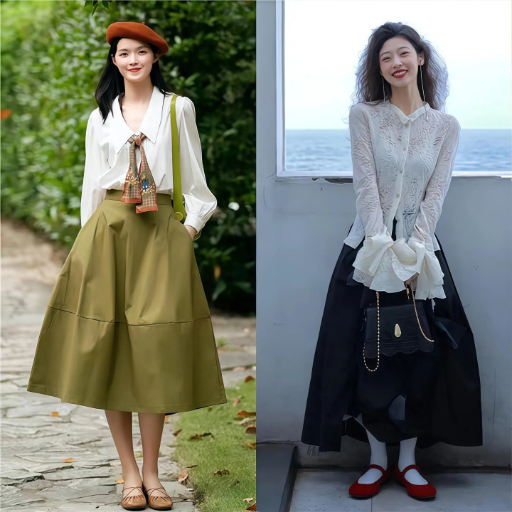 top4:A字裙+衬衫/蕾丝上衣+芭蕾舞鞋,暄和感径直扑满