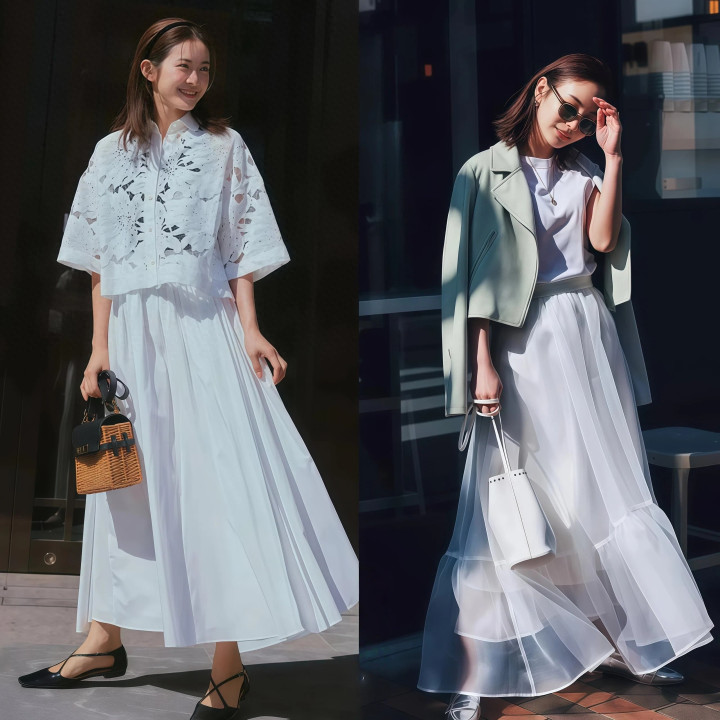 蕾丝上衣不要选那种全身都是蕾丝的式样,只在领口袖口带少量蕾丝细节就够了,大面积蕾丝穿出来,容易显得太弘大,跟通俗的A字裙画风不搭,克制地用少量点蕾丝反倒更小巧。
