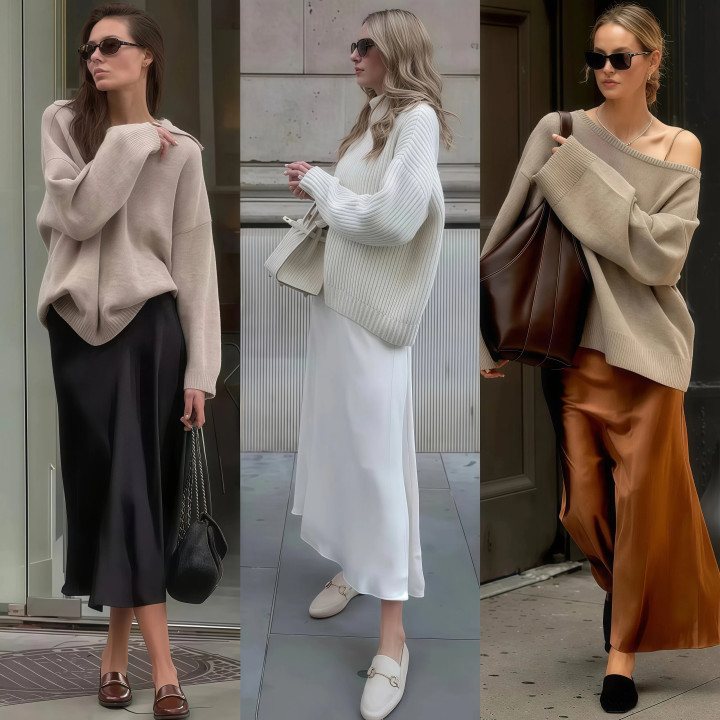 缎面裙的光芒感和乐福鞋的随心感放在一王人相配妙,上头搭一件纯色圆领毛衣,整套穿搭的调性很克制很满足,一看就有品位,缎面裙提出选哑光质料的,不要选亮闪闪那种,乐福鞋容貌选玄色棕色或然酒红色最百搭。
