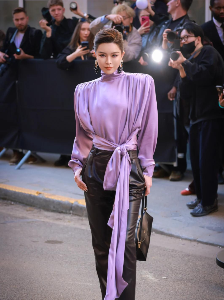 紫色本人就终点挑东谈主,缎面材质又极其检修身段随和质,再加上夸张的垫肩盘算推算,稍有失慎就会翻车。