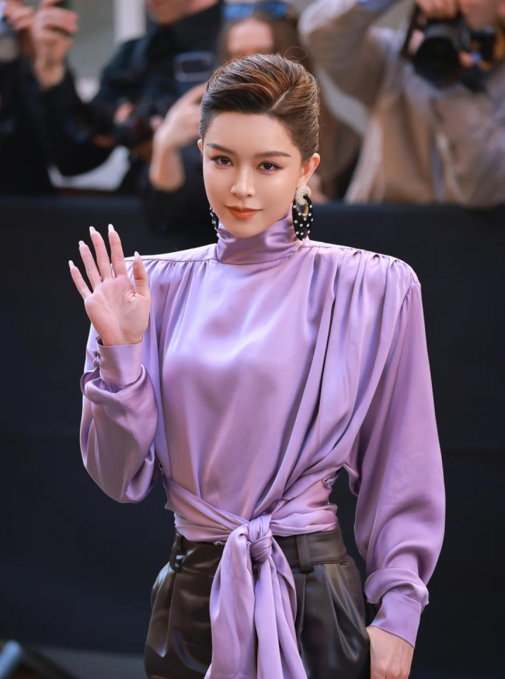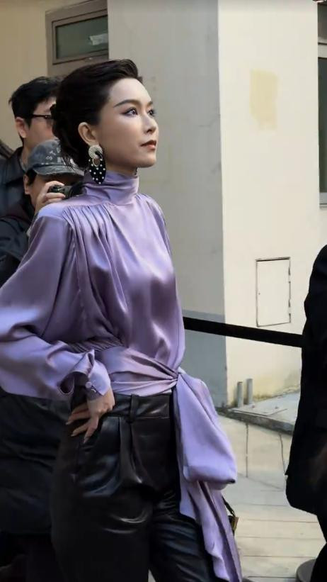 先说说文咏珊,此次她选了一件紫色缎面垫肩上衣,搭配玄色皮质长裤,走的是大气利落的阶梯。