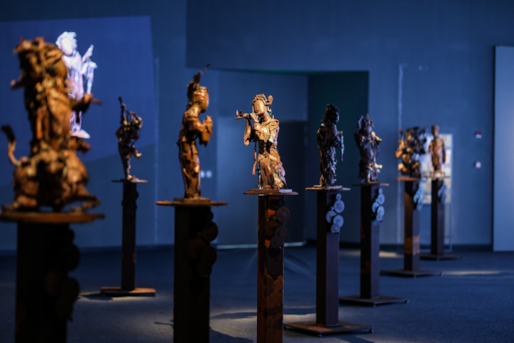 焦兴涛参展的废铁东谈主物“魂·韵”系列创作始于1999年,他以中国传统雕镂与画图中的肢体姿态为母本,选定工业废铁行为创作引子,在材料选定上暗合1999年中国从纺织业向机械制造业转型的历史节点:生锈的铁皮既是工业化程度的物资遗存,亦成为传统肢体好意思学在现代性语境中的异质载体。在2024年的新版块中,艺术家在锈蚀雕镂与全新金属底座的基础上,引入东谈主工智能生成的动态影像。